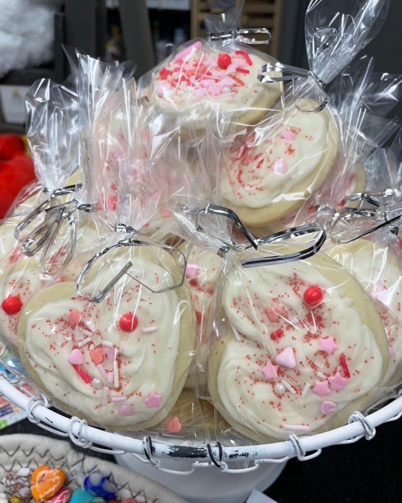 The Sweet Stroll Refreshments: A picture of heart shaped cookies with frosting. Treats will be offered by various businesses during the Sweet Stroll.